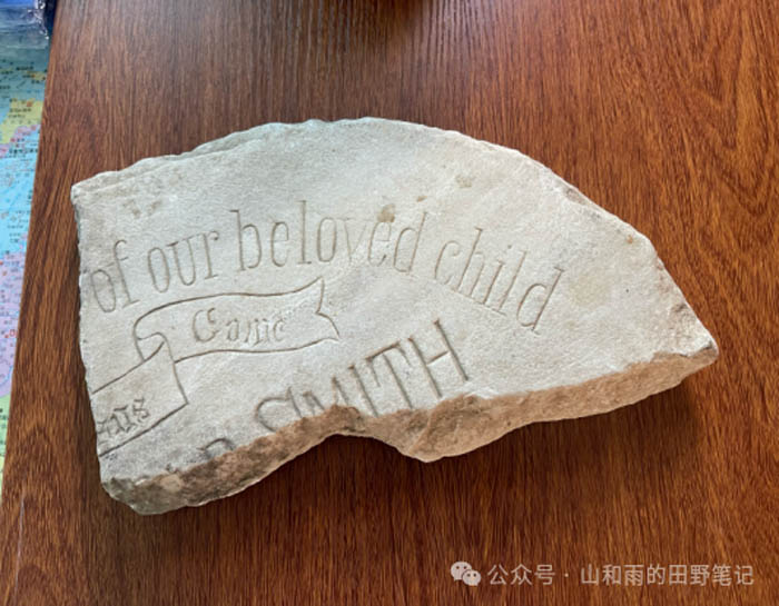 来之前,长老家中保存的一角残破墓碑石——上面刻着“of our beloved child”,是我们对这块墓地唯一的直观感受。