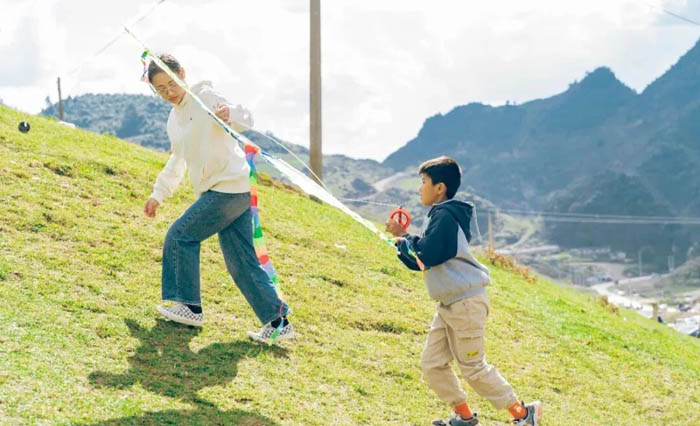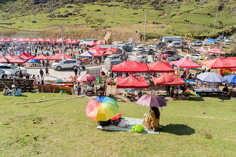 人们就像蜜蜂在红花里采蜜一般穿梭在一把把红伞中,有的人逛累了买上一杯麦芽茶,带上几份小吃,到草地里选个好位置边吃边聊;有的人买了风筝带着小孩在草地里跟着清爽的风一起撒欢;有的人和布朗族阿哥阿妹一起在集市中载歌载舞;还有的人远远地搭个天幕,约三五好友赏这山野景色,也赏这人间喜乐……