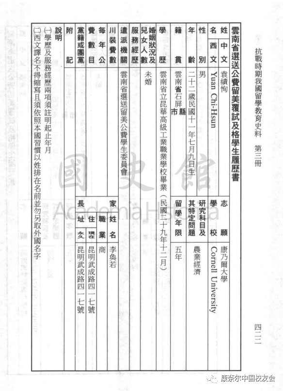 康奈尔中国校友会: 寻找老校友袁绩恂的任何信息